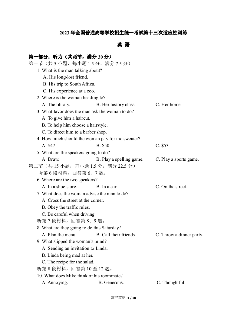 高三英语--陕西省西北工业大学附属中学2023届高三下学期第十三次适应性训练