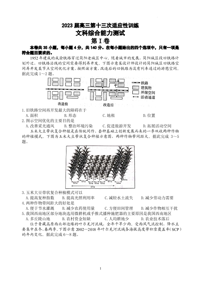 高三文综--陕西省西北工业大学附属中学2023届高三下学期第十三次适应性训练