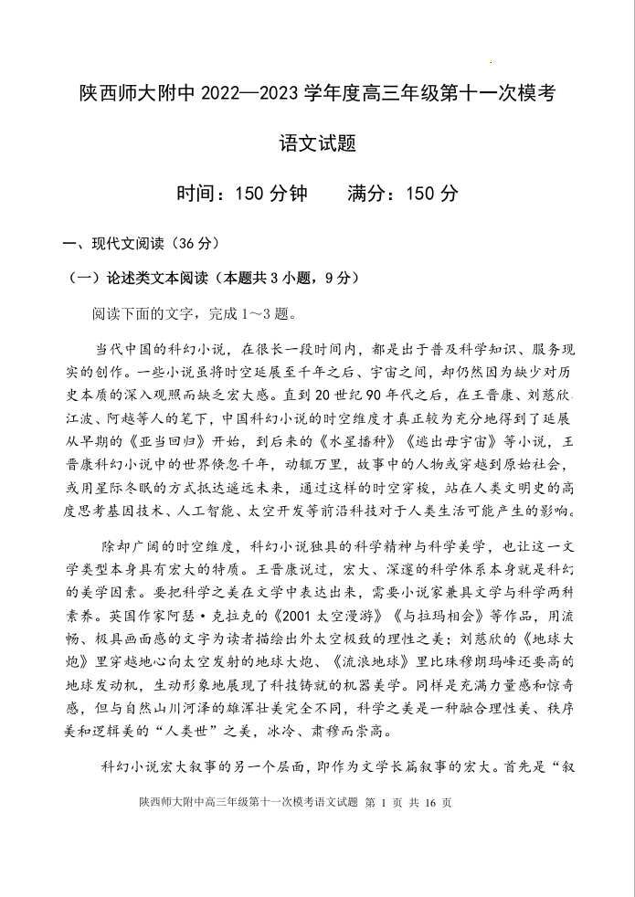 高三语文--陕西师大附中2022-2023学年度高三年级第十一次模考