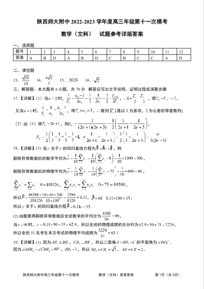 高三文数答案--陕西师大附中2022-2023学年度高三年级第十一次模考