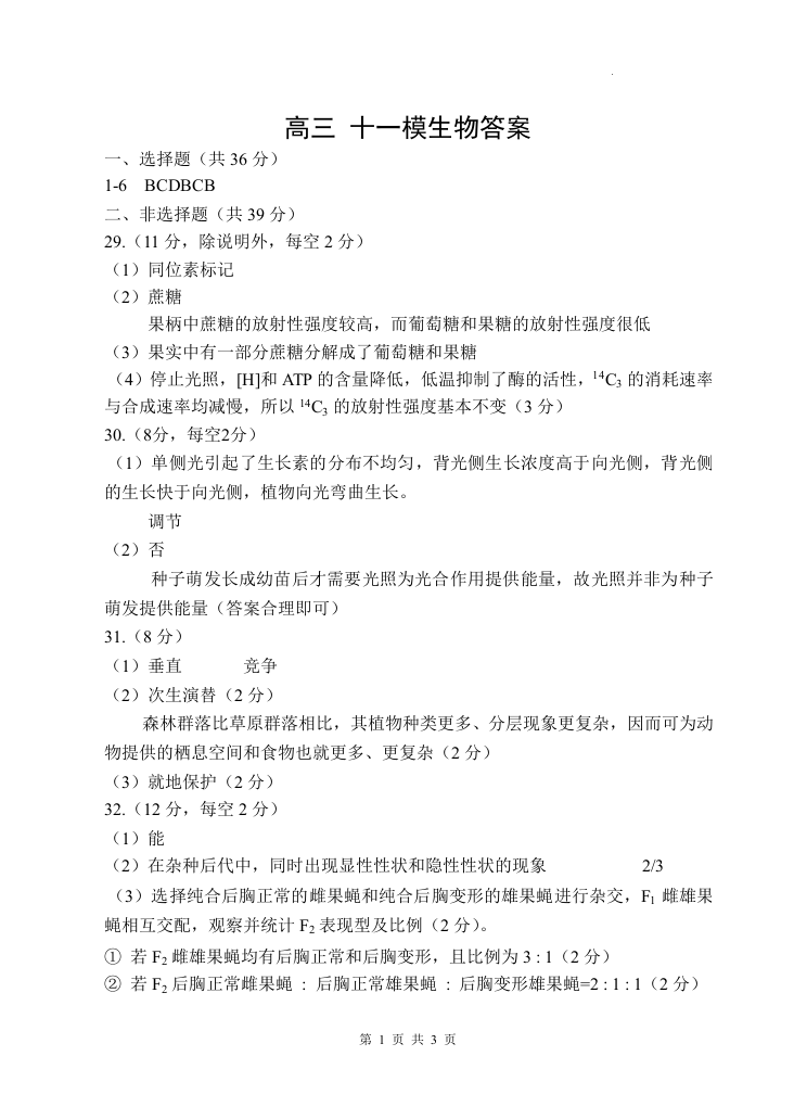 高三生物答案--陕西师大附中2022-2023学年度高三年级第十一次模考