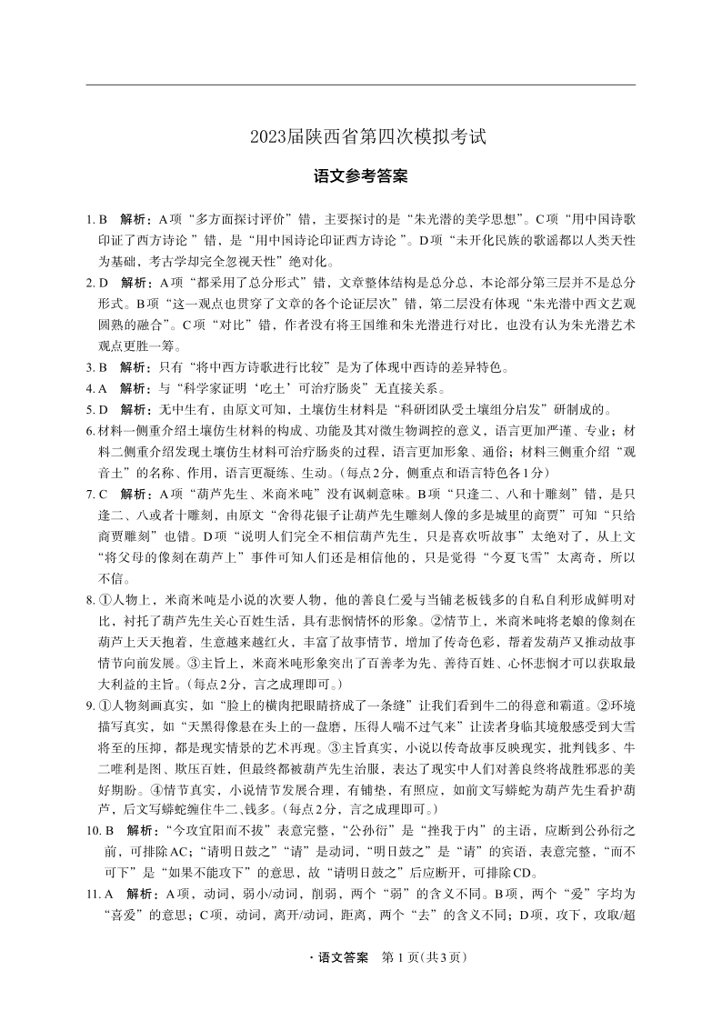 高三语文答案--陕西省2023届第四次模拟考试(菁师联盟)