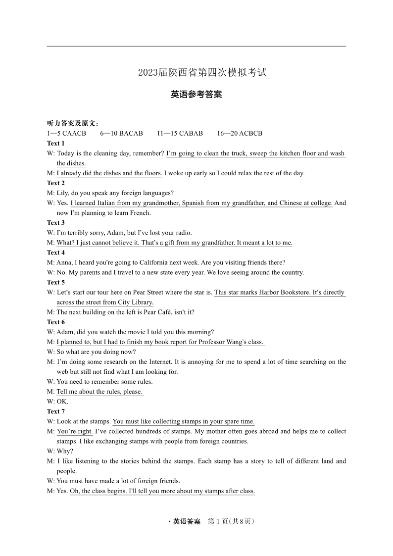 高三英语答案--陕西省2023届第四次模拟考试(菁师联盟)