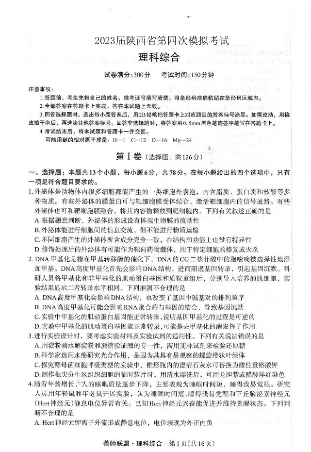 高三理数--陕西省2023届第四次模拟考试(菁师联盟)