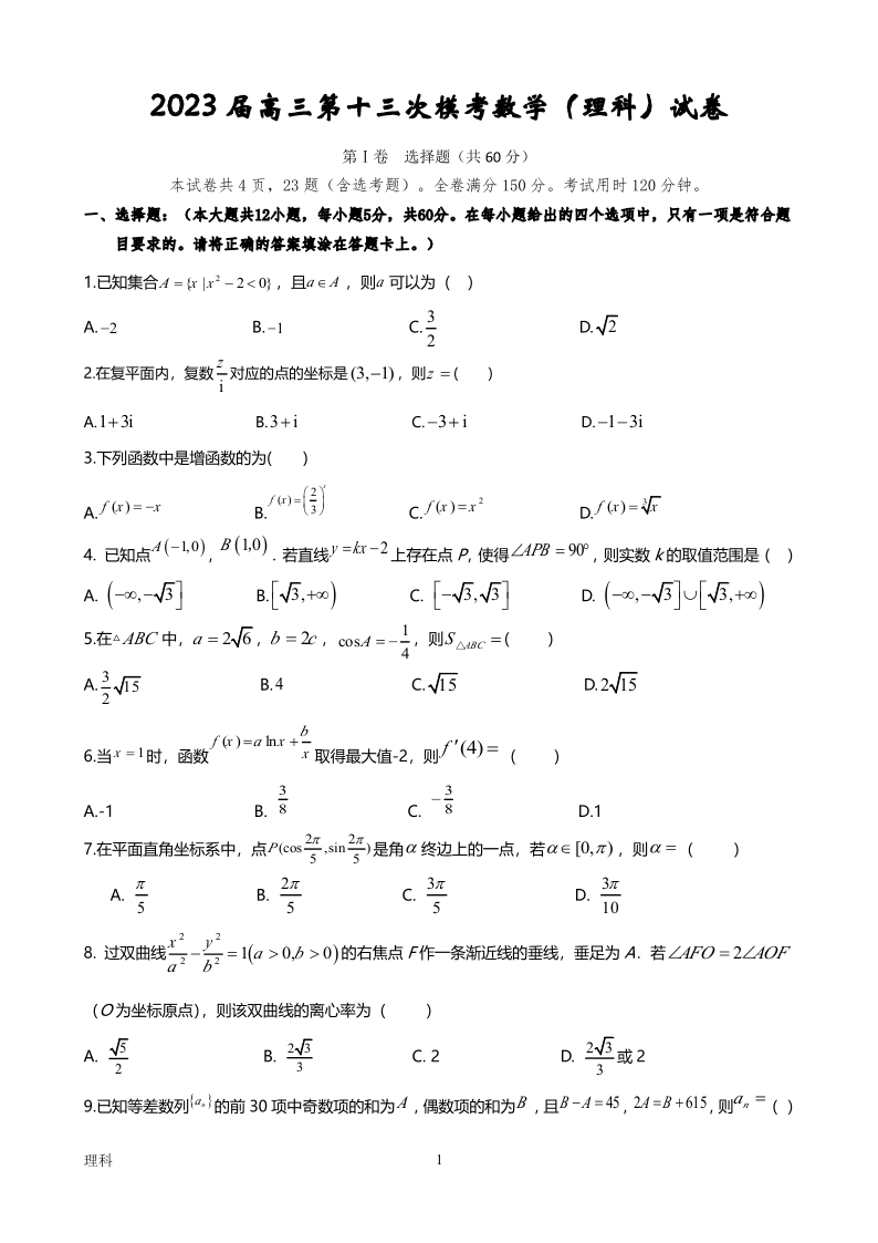 高三理数+答案--陕西省宝鸡市2023届高三第十三次模考
