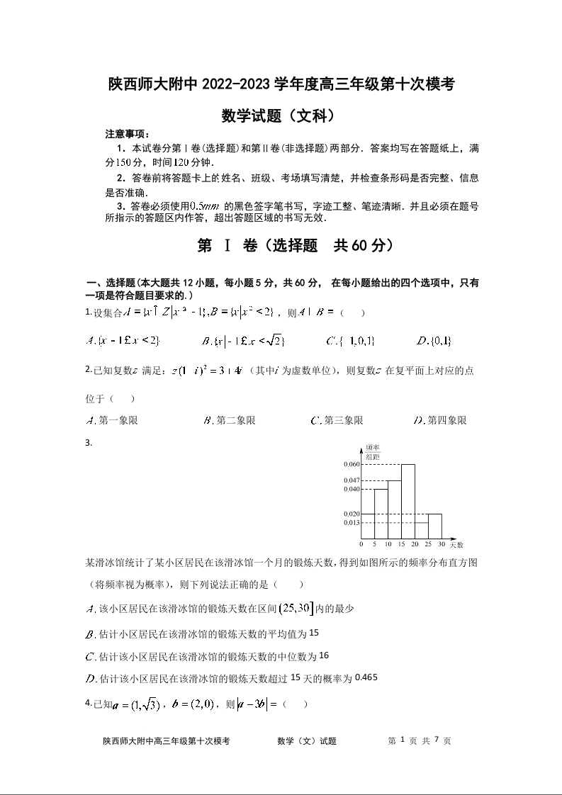 高三文数--陕西省西安市陕西师范大学附属中学2022-2023学年高三下学期第十次模考
