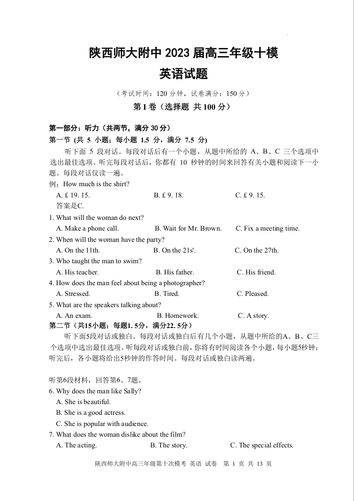 高三英语--陕西省西安市陕西师范大学附属中学2022-2023学年高三下学期第十次模考