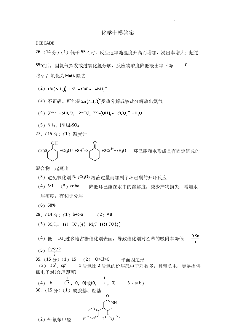 高三化学答案--陕西省西安市陕西师范大学附属中学2022-2023学年高三下学期第十次模考