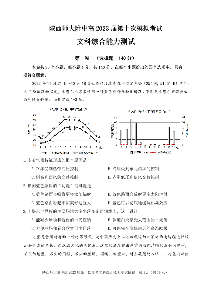 高三文综--陕西省西安市陕西师范大学附属中学2022-2023学年高三下学期第十次模考