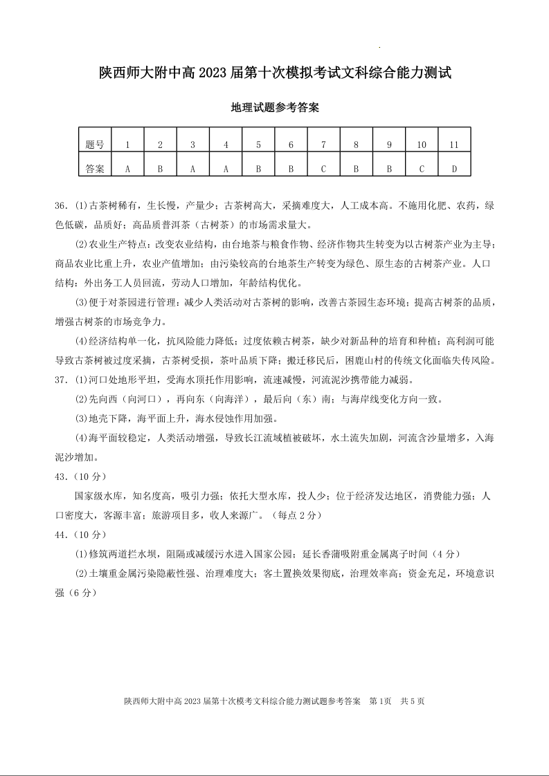 高三文综答案--陕西省西安市陕西师范大学附属中学2022-2023学年高三下学期第十次模考
