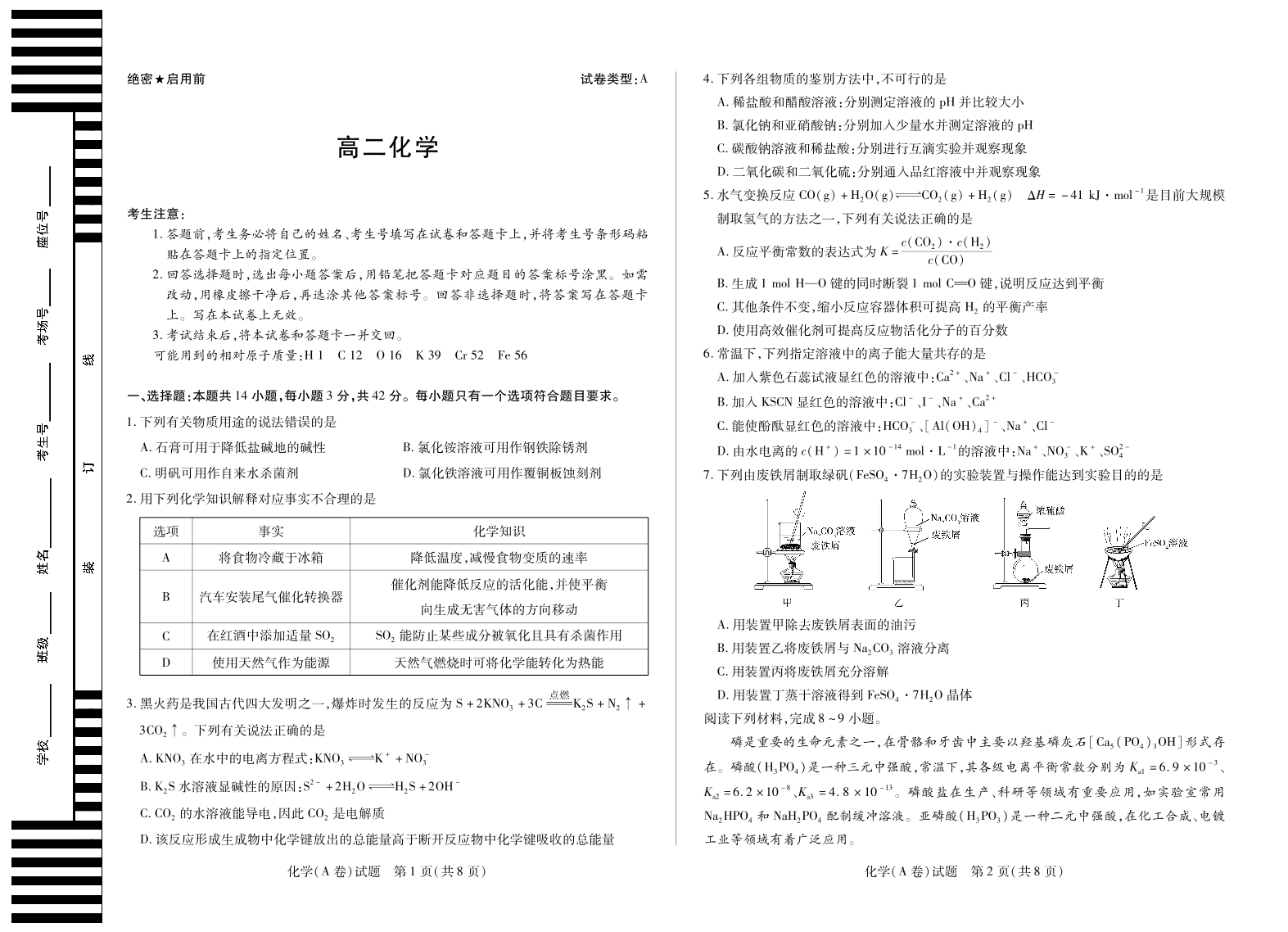 高二化学A--安徽省部分学校(合肥六中)2025-2026学年高二上学期12月联考