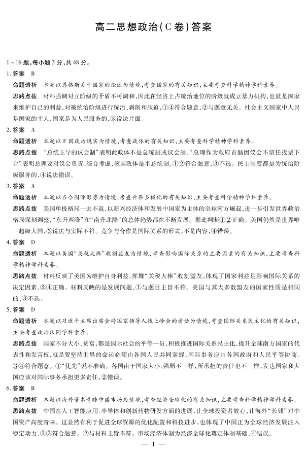 高二政治C答案--安徽省部分学校(合肥六中)2025-2026学年高二上学期12月联考