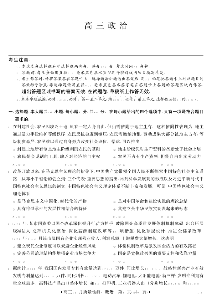 高三政治--辽宁黑龙江吉林内蒙古九师联盟高三12月质量检测