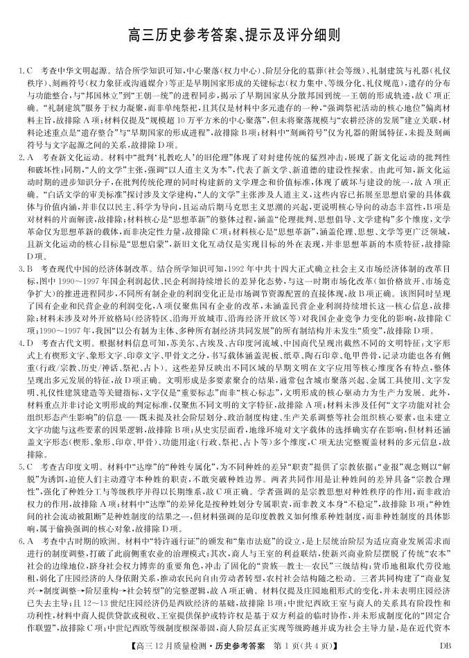 高三历史答案--辽宁黑龙江吉林内蒙古九师联盟高三12月质量检测