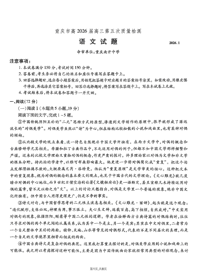 高三语文--重庆市南开中学2026届高三第五次质量检测