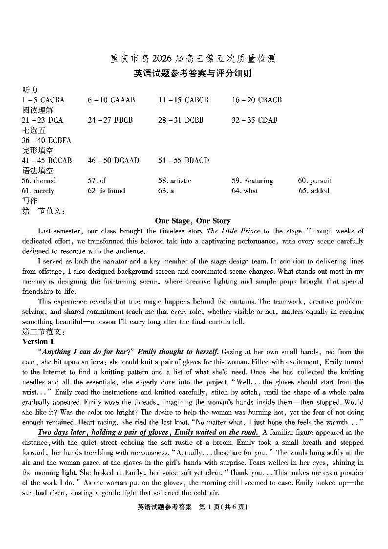 高三英语答案--重庆市南开中学2026届高三第五次质量检测