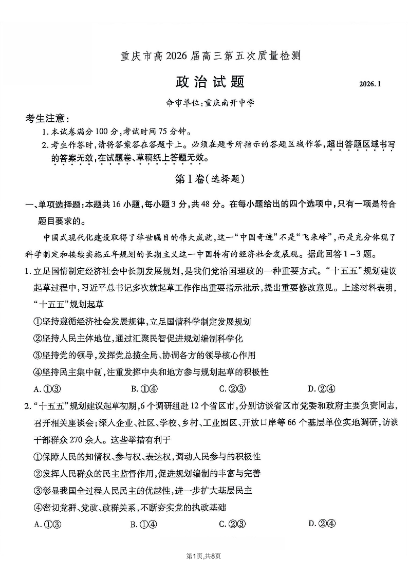 高三政治--重庆市南开中学2026届高三第五次质量检测