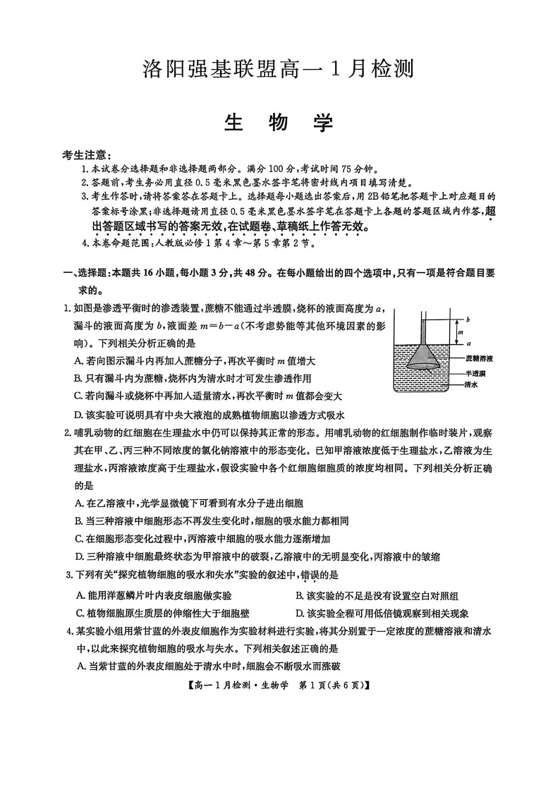高一生物+答案--河南省洛阳市强基联盟2025-2026学年高一上学期1月检测