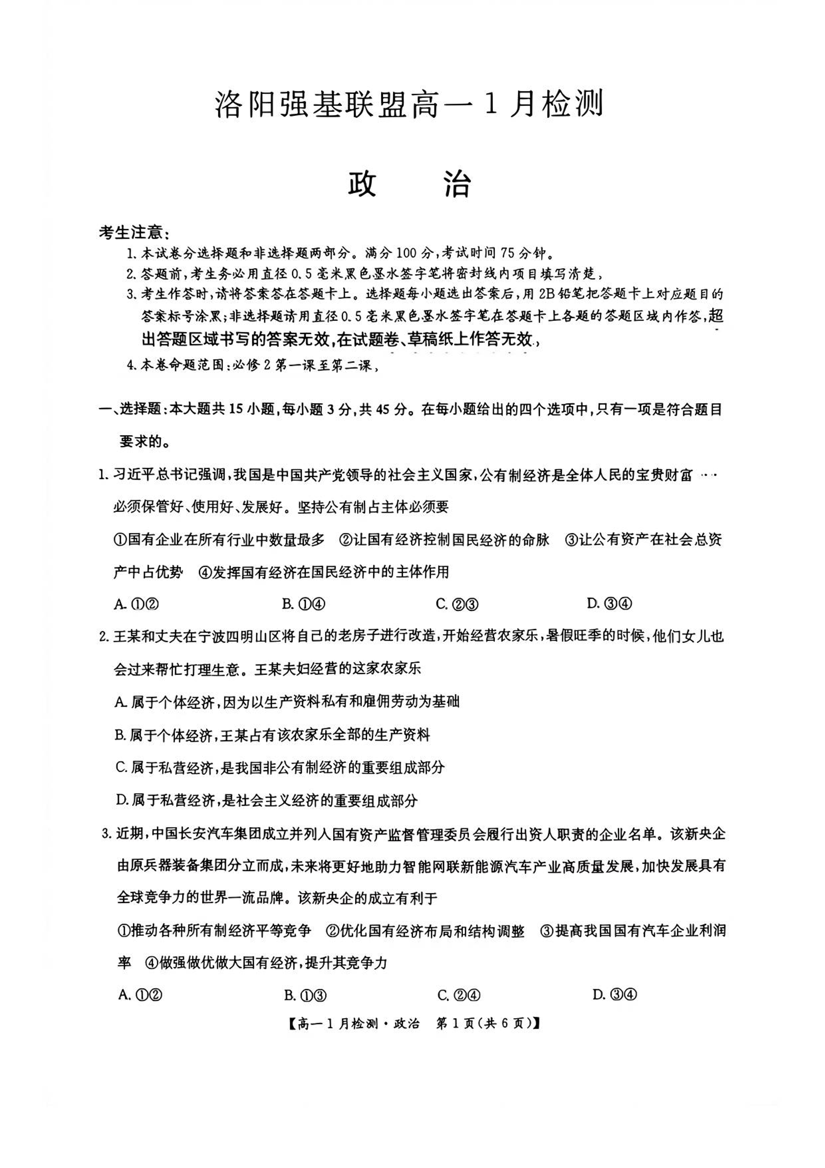 高一政治--河南省洛阳市强基联盟2025-2026学年高一上学期1月检测