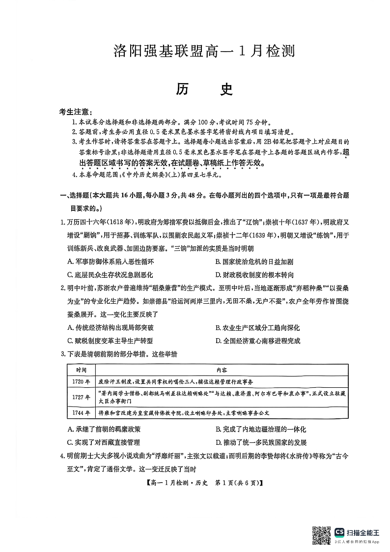 高一历史--河南省洛阳市强基联盟2025-2026学年高一上学期1月检测