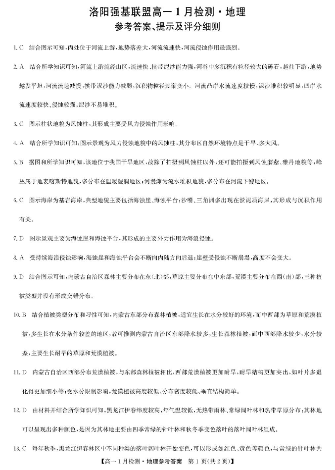 高一地理答案--河南省洛阳市强基联盟2025-2026学年高一上学期1月检测