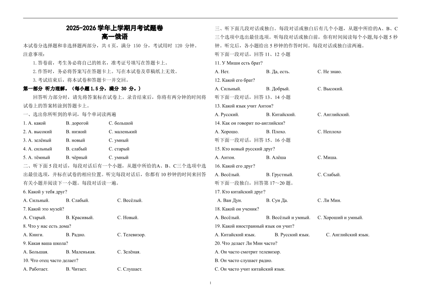 高一俄语--河南省洛阳市强基联盟2025-2026学年高一上学期1月检测
