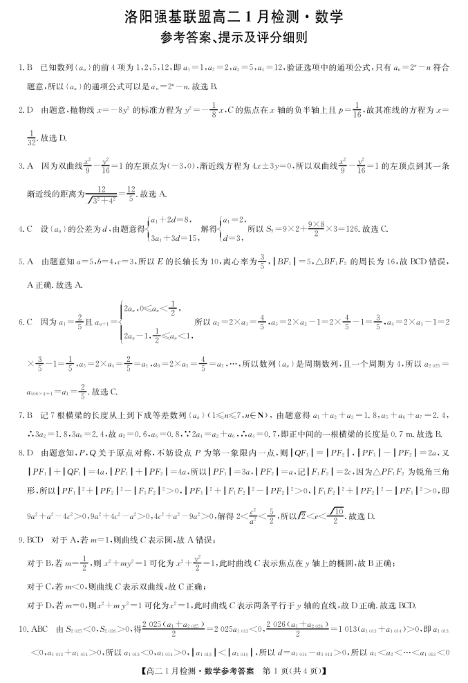 高二数学答案--河南省洛阳市强基联盟2025-2026学年高二上学期1月检测