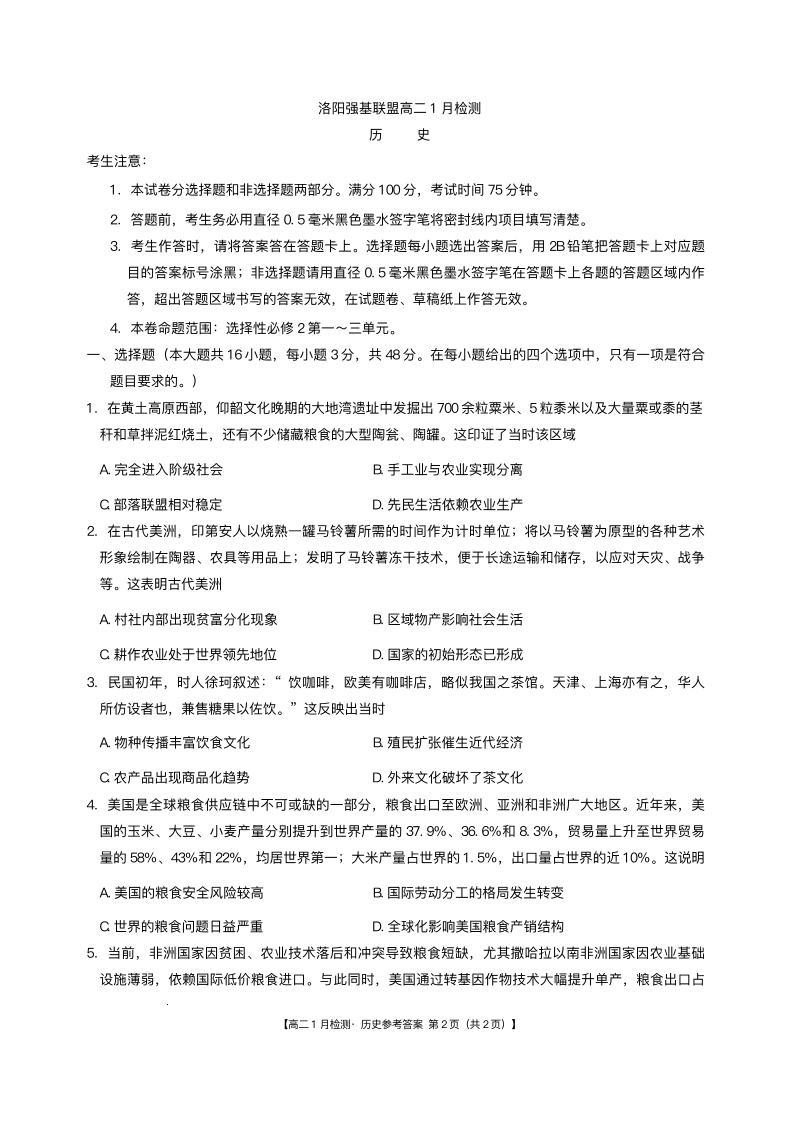 高二历史+答案--河南省洛阳市强基联盟2025-2026学年高二上学期1月检测