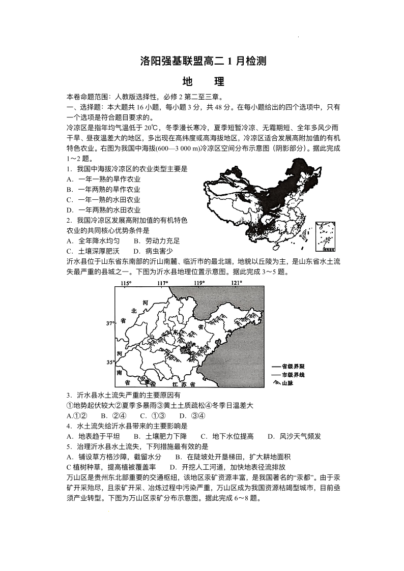 高二地理+答案--河南省洛阳市强基联盟2025-2026学年高二上学期1月检测