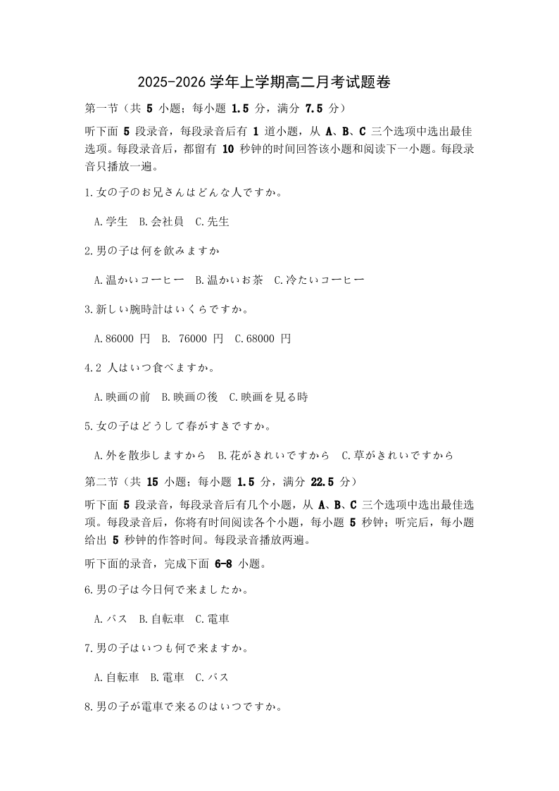 高二日语--河南省洛阳市强基联盟2025-2026学年高二上学期1月检测