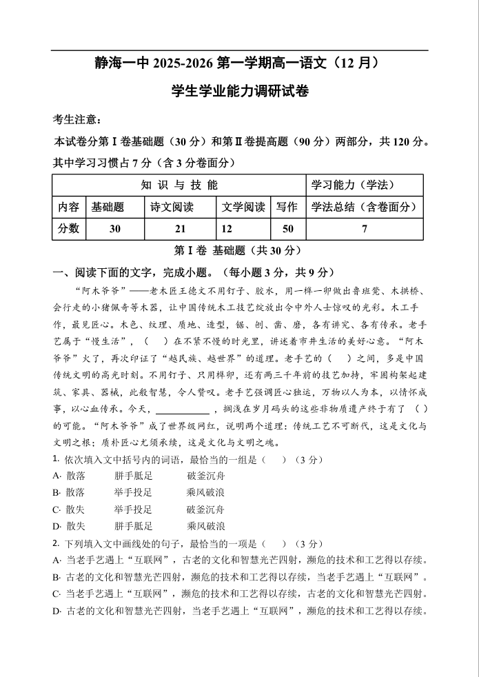 高一语文+答案--天津市静海区第一中学2025-2026学年高一上学期12月月考