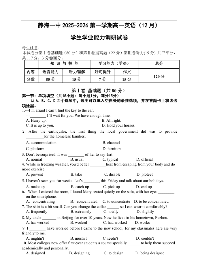高一英语+答案--天津市静海区第一中学2025-2026学年高一上学期12月月考