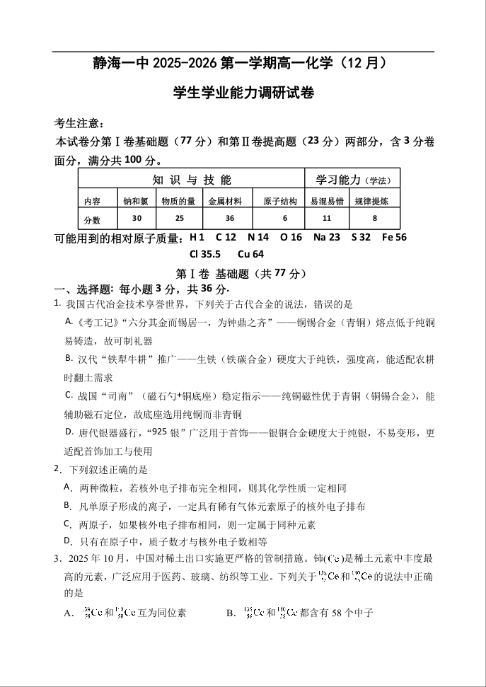 高一化学+答案--天津市静海区第一中学2025-2026学年高一上学期12月月考