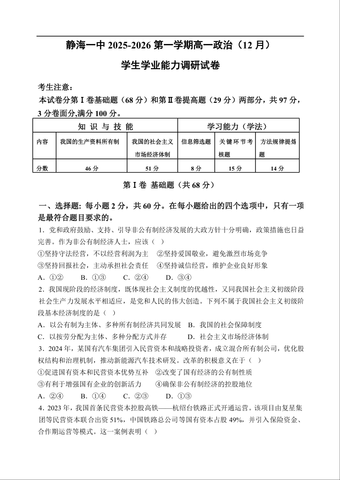 高一政治+答案--天津市静海区第一中学2025-2026学年高一上学期12月月考