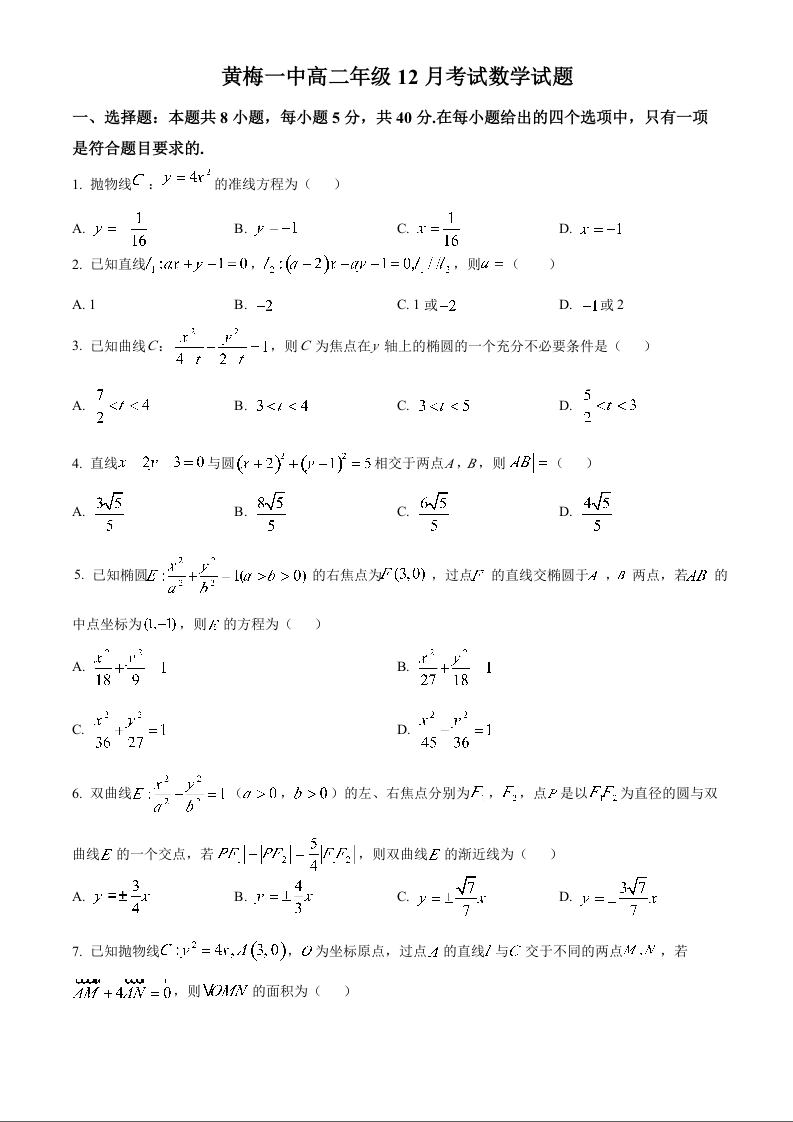 高二数学(原卷版)--湖北省黄冈市黄梅县第一中学2025-2026学年高二上学期12月月考