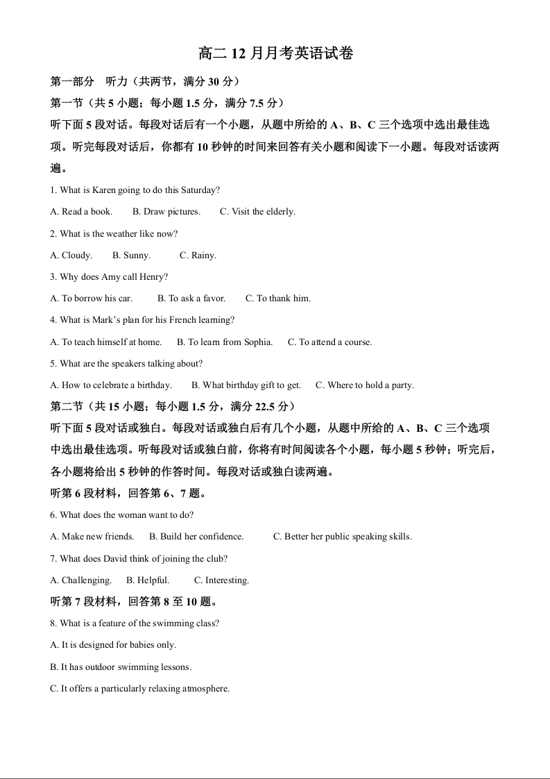 高二英语(原卷版)--湖北省黄冈市黄梅县第一中学2025-2026学年高二上学期12月月考