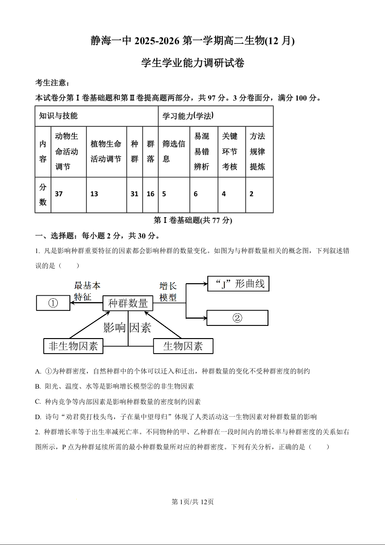 高二生物(原卷版)--天津市静海区第一中学2025-2026学年高二上学期12月月考