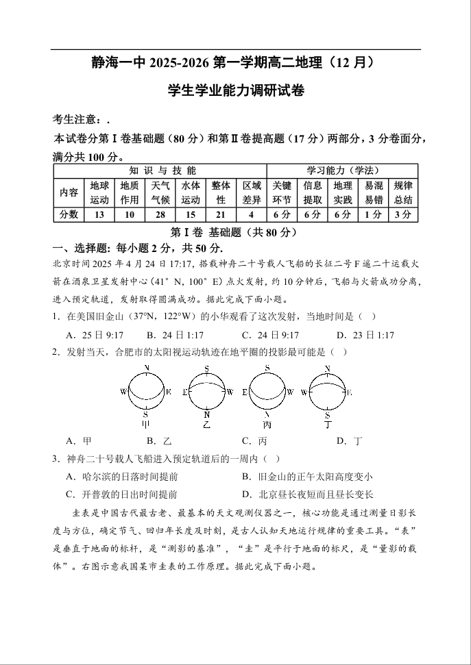 高二地理+答案--天津市静海区第一中学2025-2026学年高二上学期12月月考