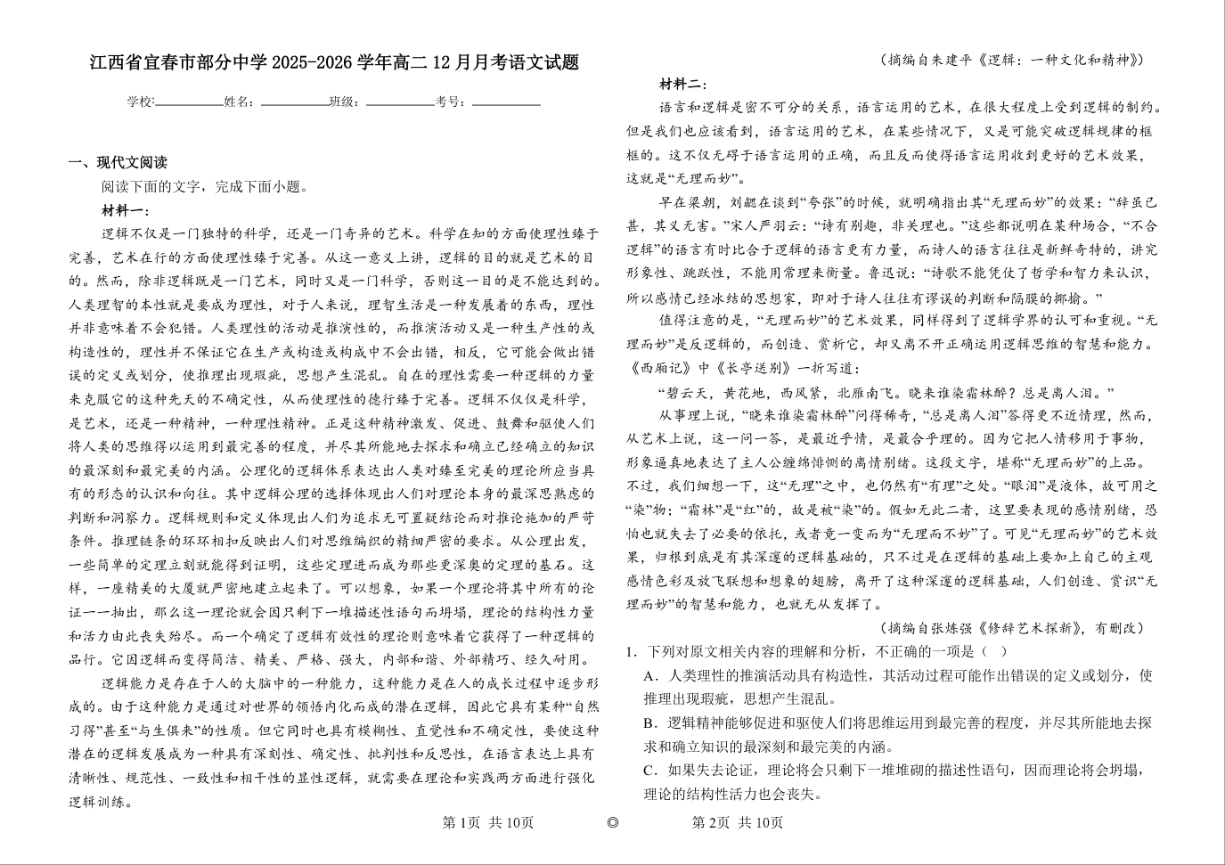 高二语文+答案--江西省宜春市宜丰中学2025-2026学年高二上学期12月月考