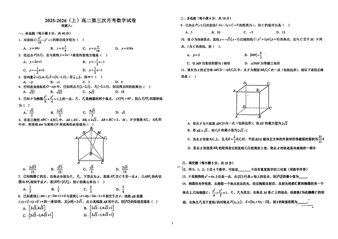高二数学+答案--江西省宜春市宜丰中学2025-2026学年高二上学期12月月考
