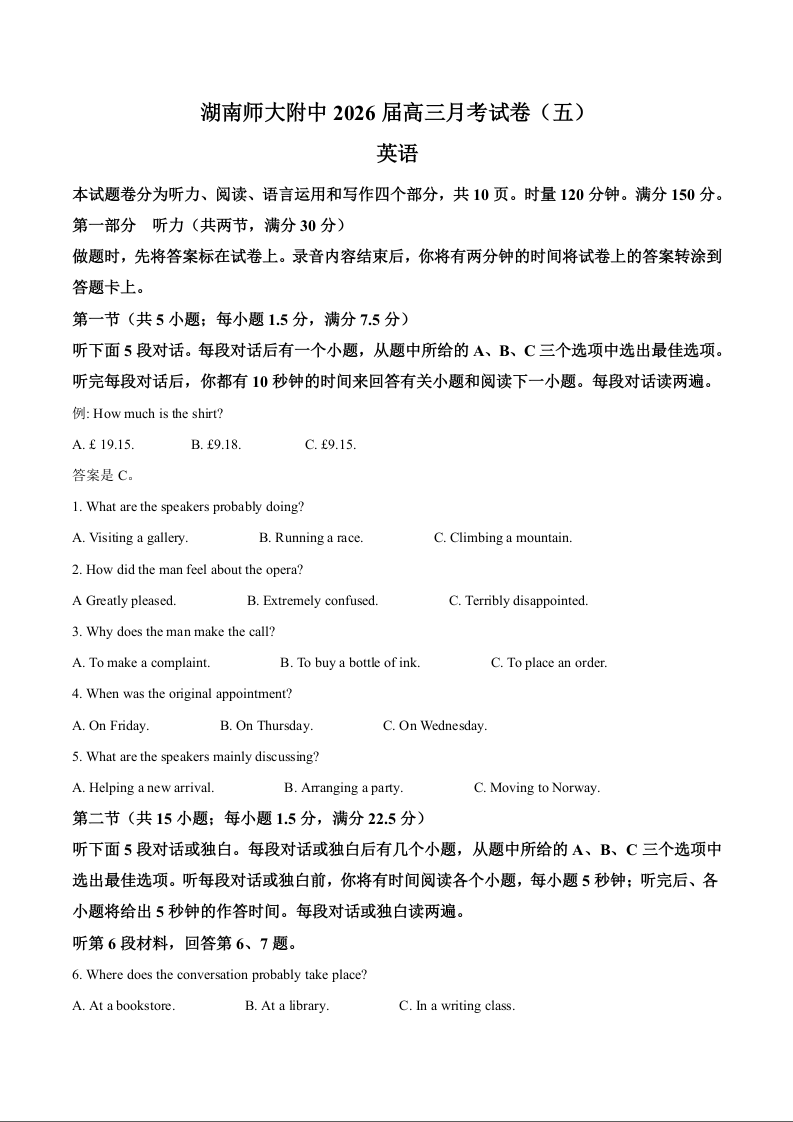 高三英语+答案--湖南师范大学附属中学2026届高三上学期月考(五)试卷(全科)
