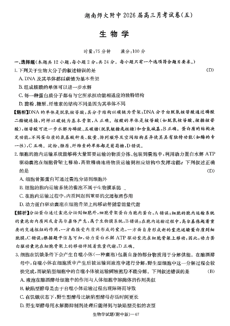 高三生物答案--湖南师范大学附属中学2026届高三上学期月考(五)试卷(全科)