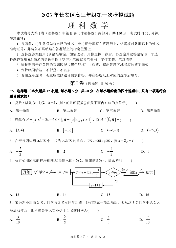 高三理数--陕西省西安市长安区2023届高三第一次模拟考试