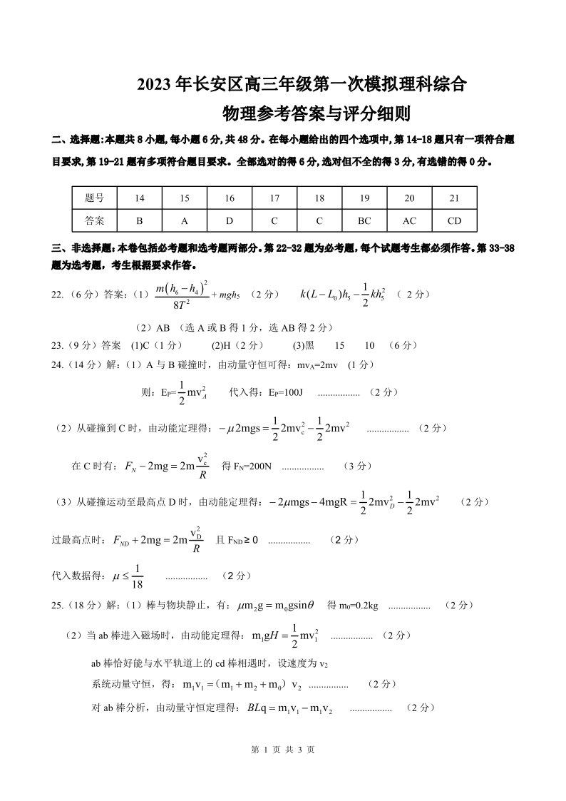 高三物理答案--陕西省西安市长安区2023届高三第一次模拟考试