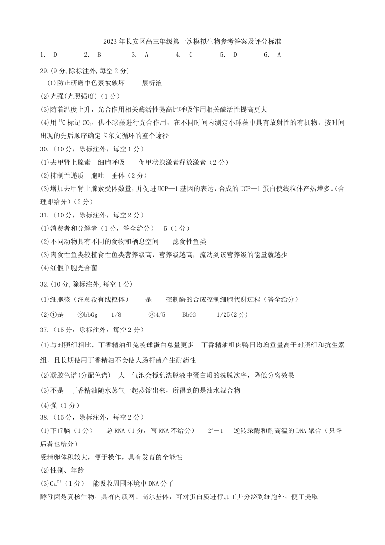 高三生物答案--陕西省西安市长安区2023届高三第一次模拟考试