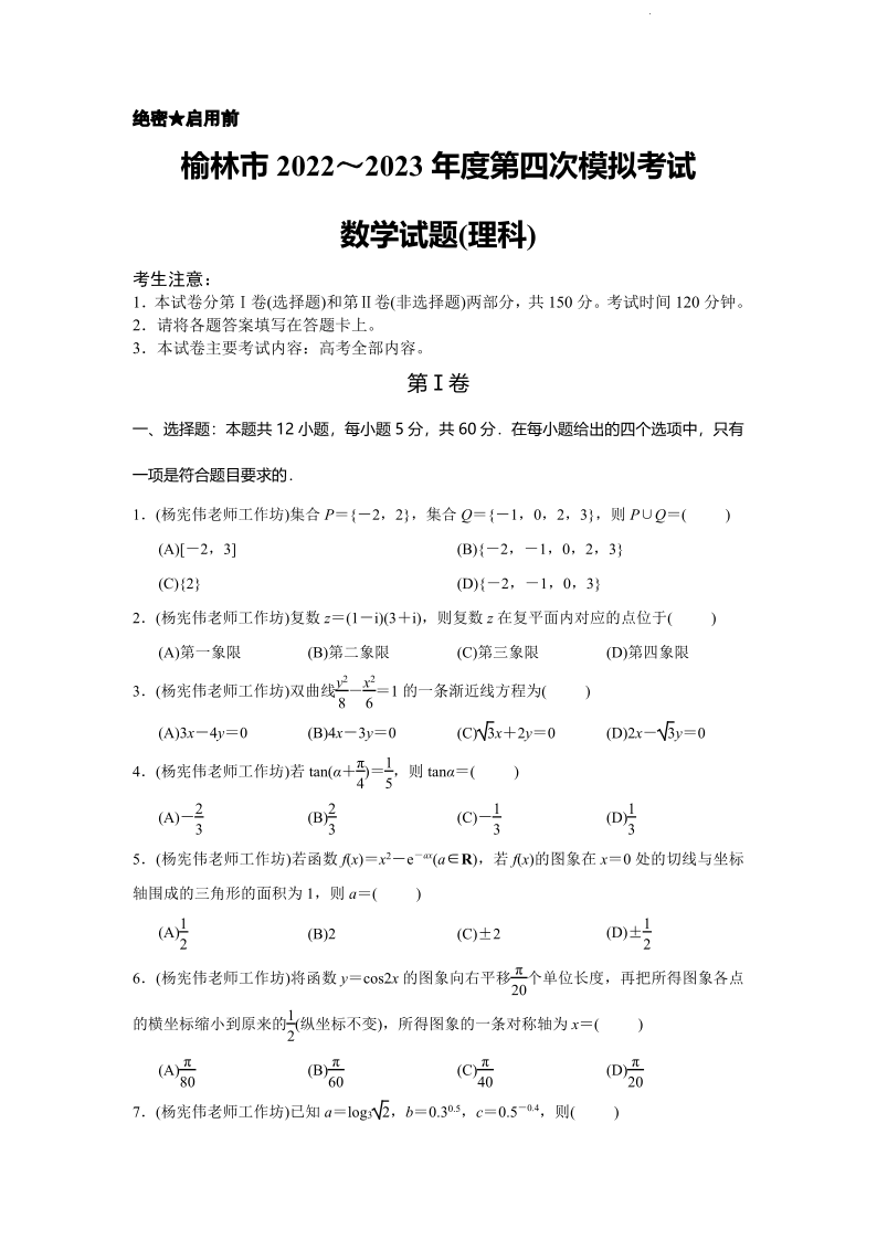 高三理数+答案--陕西省榆林市高三第四次模拟考试