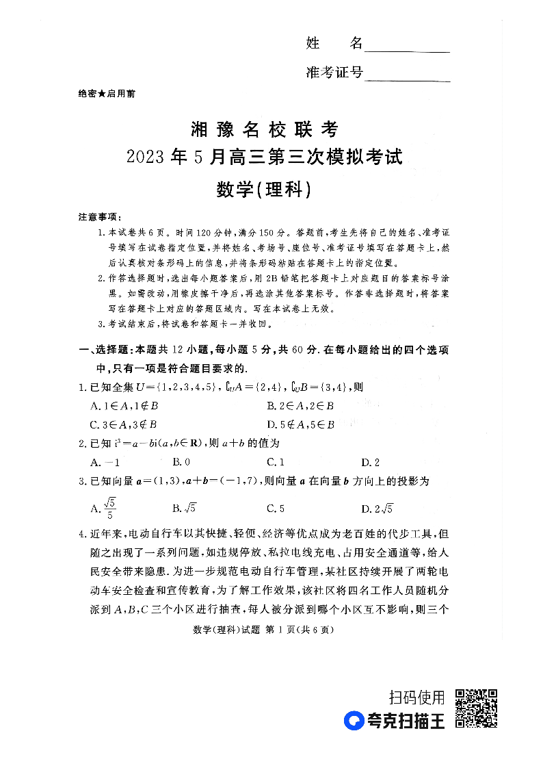 高三理数--湘豫名校联考2023届高三下学期第三次模拟考试(5月)