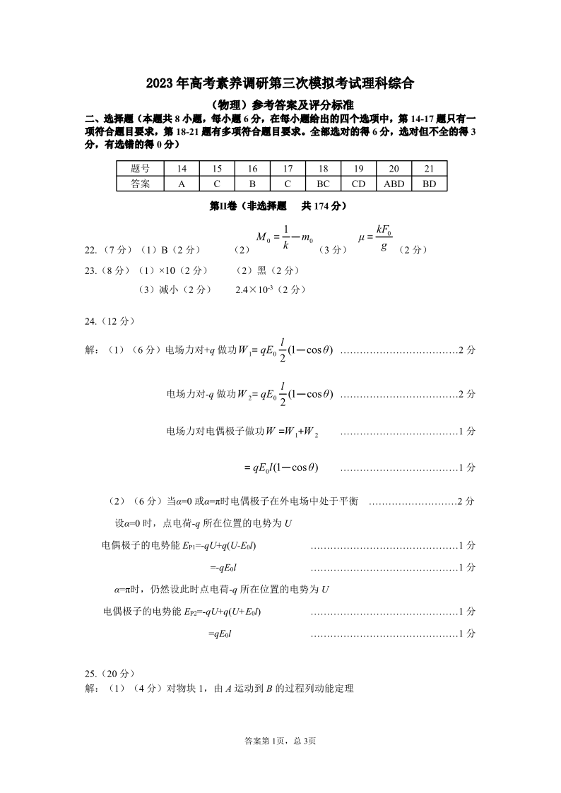 高三物理答案--新疆维吾尔自治区阿勒泰地区高三下学期高考素养调研第三次模考
