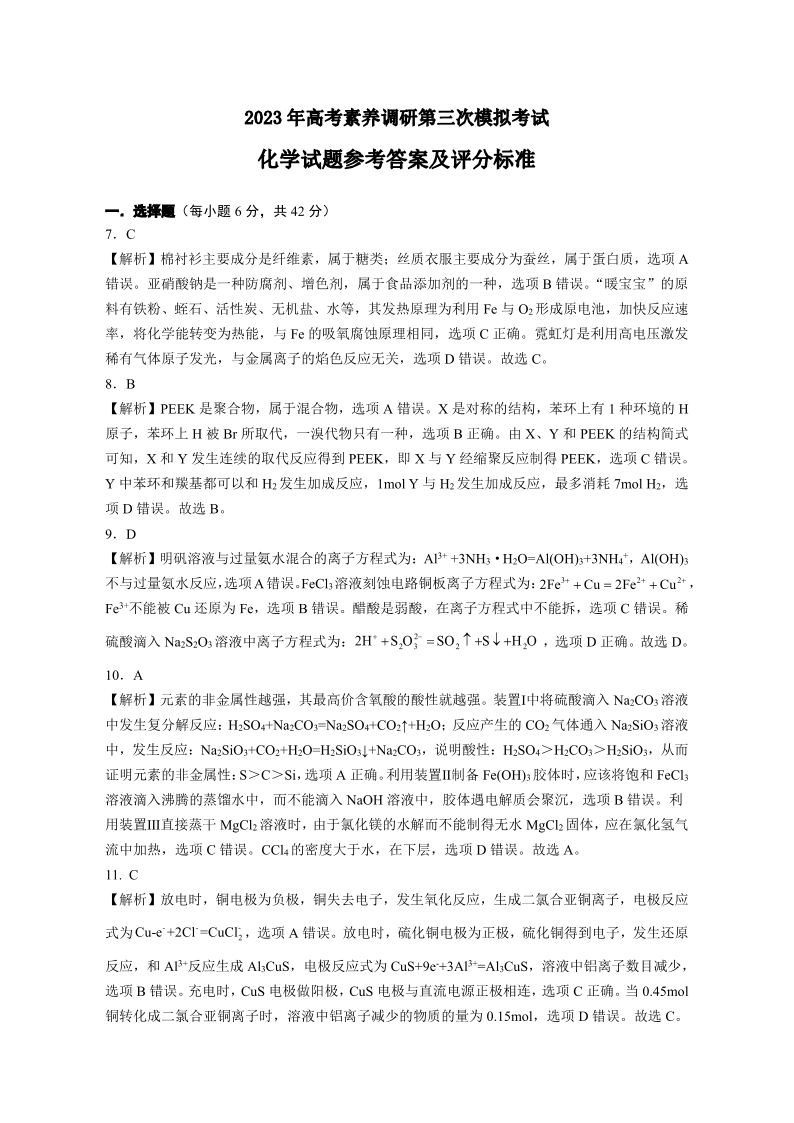 高三化学答案--新疆维吾尔自治区阿勒泰地区高三下学期高考素养调研第三次模考