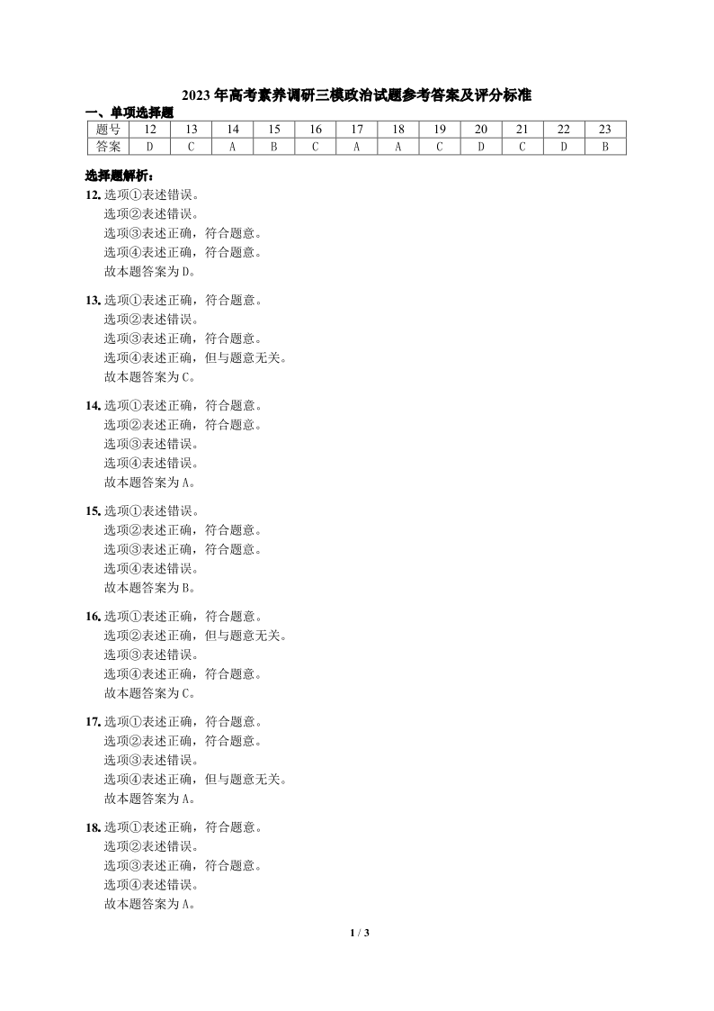 高三政治答案--新疆维吾尔自治区阿勒泰地区高三下学期高考素养调研第三次模考
